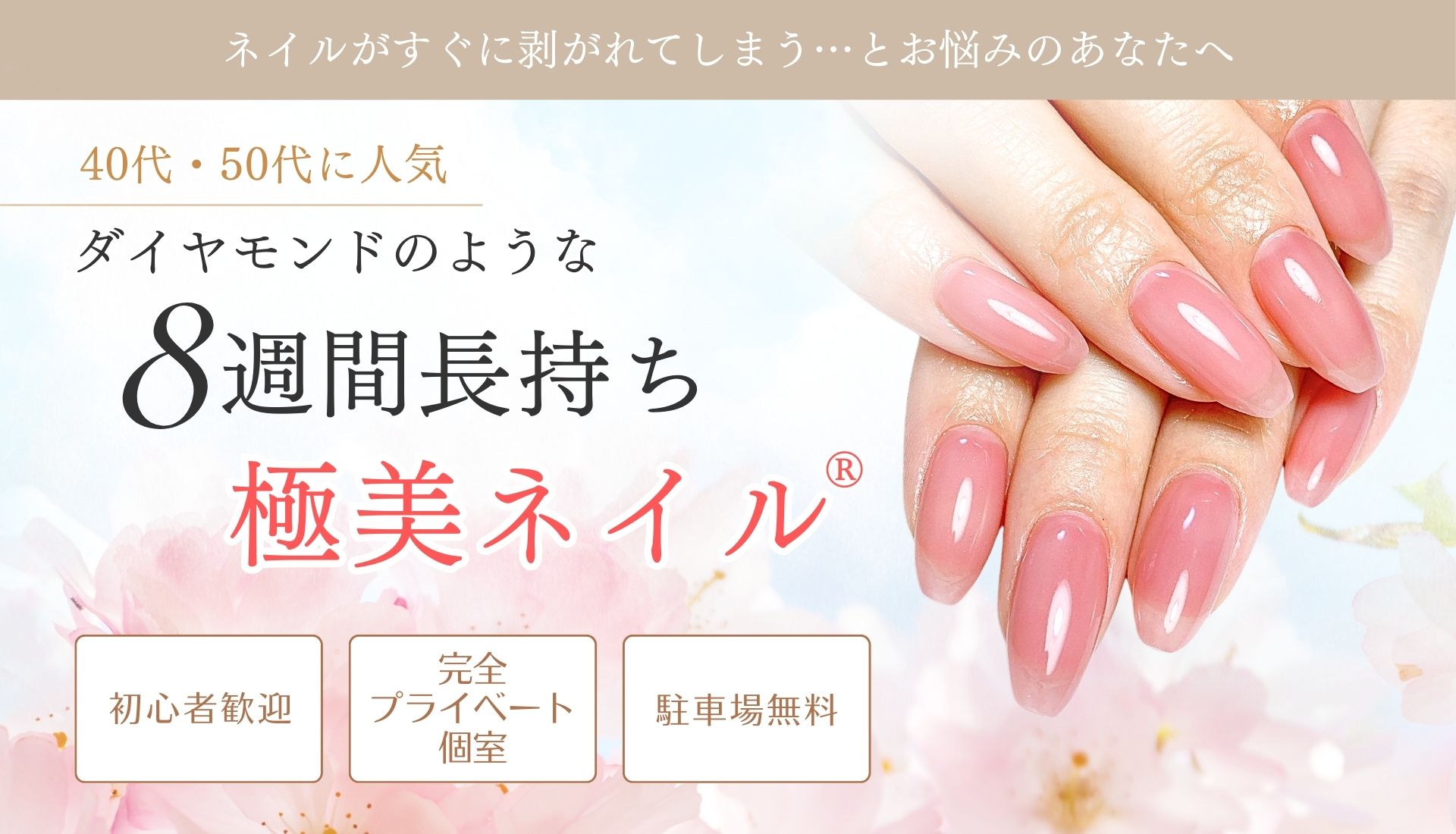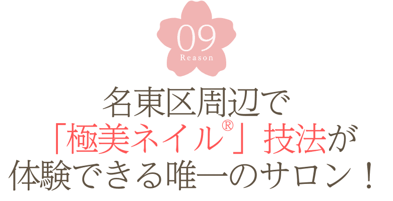 当サロンは、名東区で唯一、8週間先まで剥がれない業界トップクラスのジェルネイル「極美ネイル®︎」を提供するネイルサロンです。