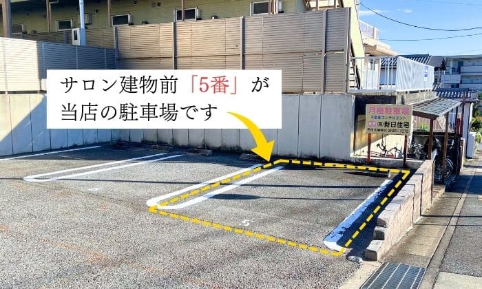 サロン建物の目の前に専用駐車場(5番)をご用意しています。