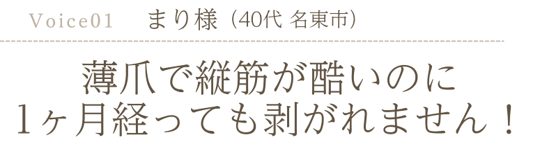 私は薄爪で縦筋が酷いのですが、1本1本丁寧に仕上げてくれるので1ヶ月経っても剥がれません。